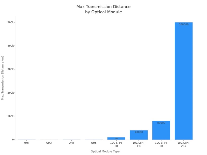You also need to consider transmission distance and connector compatibility. Multi-mode fiber modules, such as SFP+ SR, support distances up to 500 meters. Single-mode fiber modules, like SFP+ LR or ZR, extend transmission up to 80 kilometers or more. The chart below illustrates maximum transmission distances for various module types: